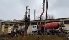Se montează stâlpii de susținere la rețeaua de electrificare pe strada Stadionului la Mediaș